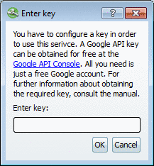At the very first use of the Google Pricesearch the Enter key dialog box appears.
