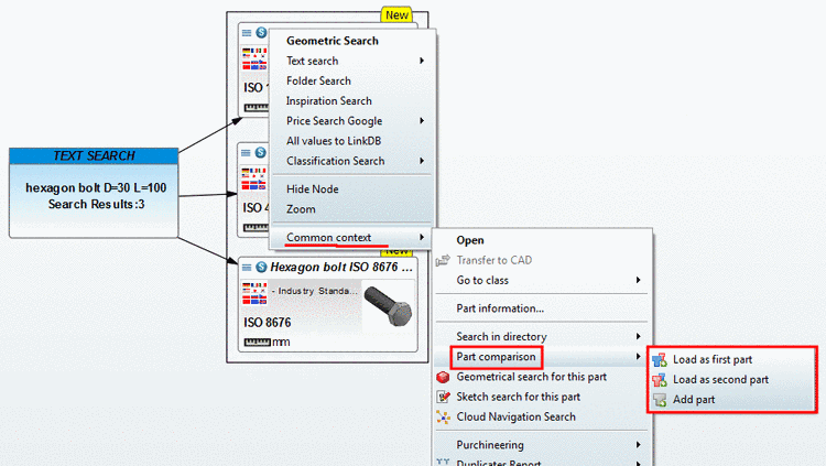 In the Cloud Navigation Search you can reach the part comparison via Common context -> Part comparison. Details on this you can find under Section 3.1.6.10, “ Part comparison ”.