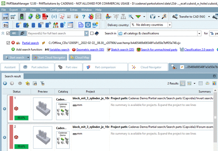 The Partial search is a geometrical search. However, not parts are used as reference, but individual features such as plane, cylinder, etc. And then parts containing these features are found. The geometrical arrangement of features is also taken into account. Parts to compare can be Standards, supplier or company parts as well.