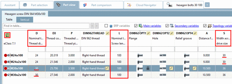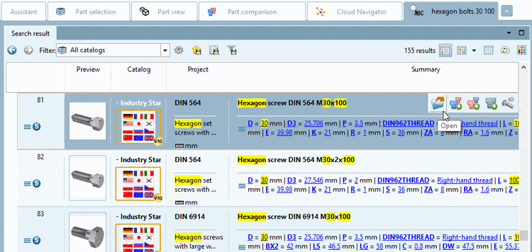 The following example shows a complete search with setting search options, result list and starting the part view. We are looking for a hexagon bolt with nominal diameter of 30 and length of 100.