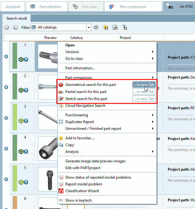 In the context menu of a part (directory tree, Symbols and Details view, Search results, Links at the commands Geometrical search for this part, Partial search for this part and Sketch search for this part you can find the button .. in new Tab. If clicking here instead of the command itself the search results are listed on a new tabbed page, otherwise on the main tabbed page.