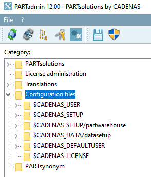 You can find basic information for all configuration files (file extension ".cfg") under PARTadmin -> Configuration files category -> Brief information [Short description] dialog area. For some configuration files, further information is displayed in the Documentation dialog area to explain more complex relationships, which is summarized in this chapter. Configuration files for controlling the ERP integration are usually referenced at Chapter 4, Strategic Parts Management . Configuration files for the CAD interfaces are referenced at Section 2.3, “CAD specific information”.