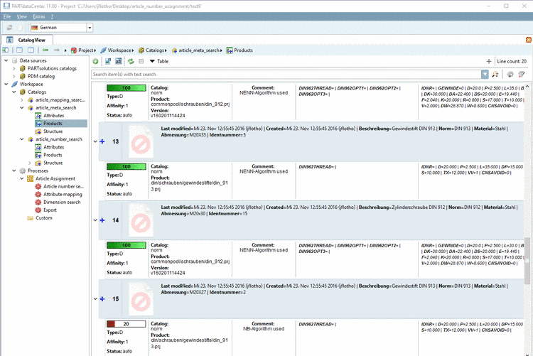 This function controls both the display of catalogs, directories and projects in the in the index tree and the display of characteristics in the table. Furthermore the search results are filtered, when this button is activated. If the button Preferred rows on/off is activated, then only a) only "green"[a] catalogs, directories and projects are displayed and b) only lines, which have an entry in a defined column (often this is the column for the article number). In other words: In the table, only green lines are displayed. The red lines are hidden.[b] you can recognize the table restriction at the filter icon . By clicking on the icon the filter is