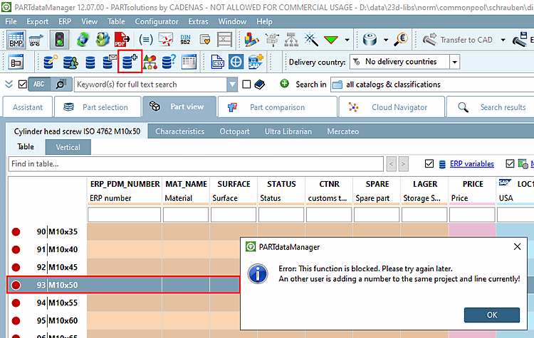 Example from PARTdataManager: User 1 has added an ERP number for table row 136. User 2 wants to add a number for another row (or the same). -> An error message is displayed. Solution: The table has to be reloaded that the real state is displayed.