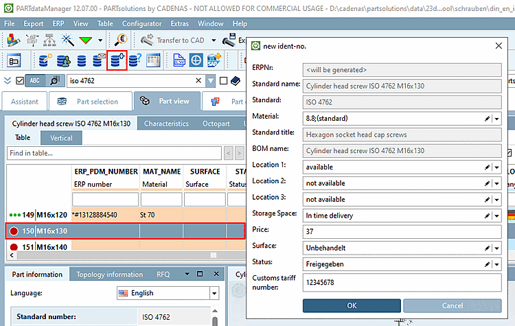 The most important feature in the PARTdataManager for the activated ERP integration is the link database [Link database] toolbar (or the ERP menu with generally identical functions).