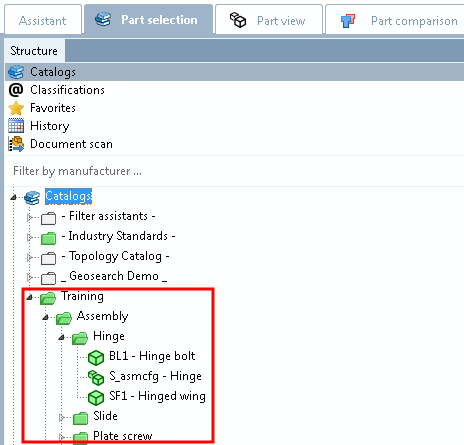 Now in PARTdataManager, the "Training" catalog with all subdirectories is displayed in green in the part selection [Part selection], although it may not contain any parts with ERP_PDM_NUMBER.