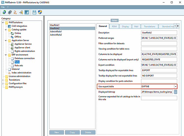 Now switch to PARTadmin in the desired role and enter the previously added table name in the Export table to be used [Use export table] field.