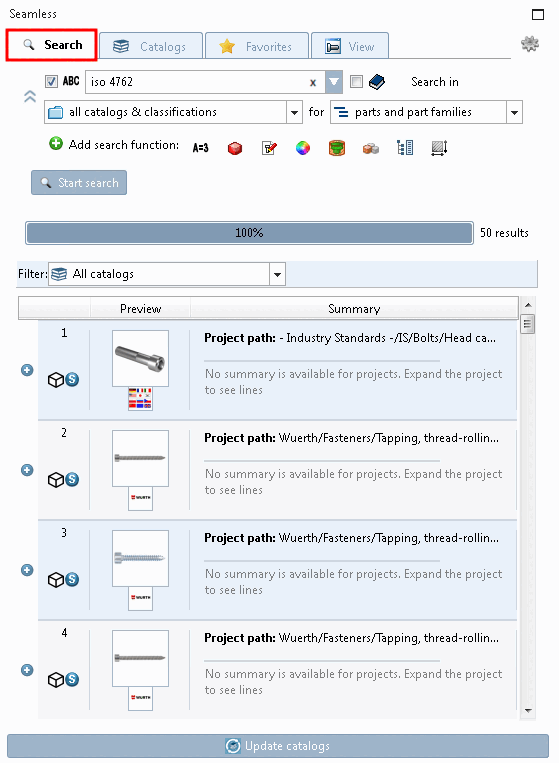 Searching for individual parts only makes sense if a result does not have too many lines. This is either because it only has a few rows or because the search has already filtered out rows. This is automatically the case with geometric searches (3D) [Geometric search (3D)] or with topology searches [Topology search] with specification of, for example, size or with full text searches [Full-text search] with additional specification of variable values.