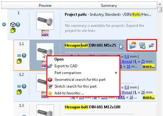 Save frequently used parts as favorites. See also Section 2.6.6.3, “ Favorites " tab page”. The command is available both at part family level and at individual part level. |