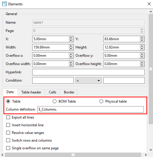 The column and value output in tables is controlled via media variables. The variable specified in the PARTtemplateDesigner is referenced in the Media Editor [Media editor].[120]