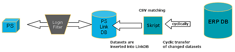 • All changes are cyclically (e.g. daily) passed on to a script via CSV file, which is exported from an ERP system. The CSV file only contains data records changed during the cycle.)