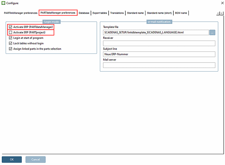 ERP activation for PARTdataManager and PARTproject can be carried out separately via the user interface or configuration file: