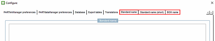 PARTlinkManager -> Extras menu -> Configure ERP environment -> Standard designation [Standard name], standard designation (short) [Standard name (short)] and parts list designation [BOM name] tab page