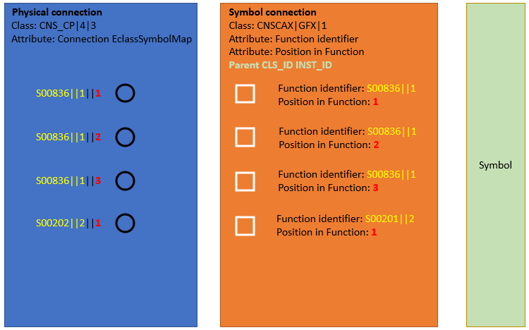 This means that we must link the 2D symbol connection in particular with the associated function and the position in the function. In other words, the task can be expressed by the following sentence: "This 2D connection with the following X/Y coordinates belongs to the Nth function and is the Xth device connection in it." A symbol connection therefore needs 2 indices (function [Function identifier ] and position within the function [Position in Function ]). This is completely analogous to the construction of the Connection EclassSymbolMap attribute in CNS_CP|4|3.