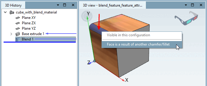Initial situation: The Blend feature has been applied to an edge between two faces. A material has been assigned to the faces. The material cannot automatically be applied to the rounded face (blend).