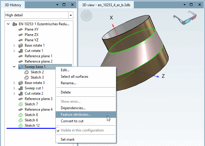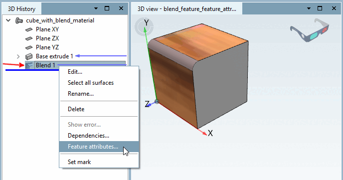 Instead, call up the context menu via Blend in the 3D History docking window and click on Feature attributes.... [Feature attributes...]