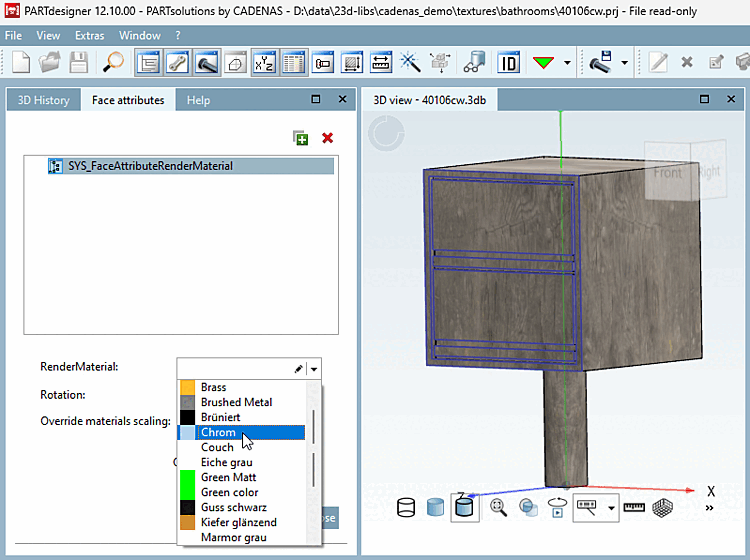 The render materials [Render materials] created are also available in the PARTdesigner in the Areas Attributes [Face attributes] dialog box.
