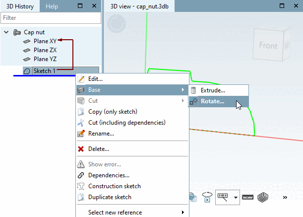 1. In the History dialog area, click with the secondary mouse button on the sketch 1 just created.
