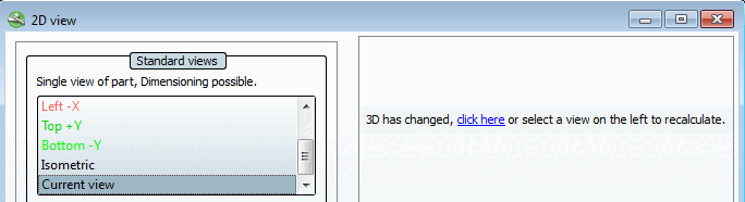 If you want to transfer the currently set alignment of the coordinate system from the 3D view to the 2D derivation, select the Current view option at the bottom of the list box. |