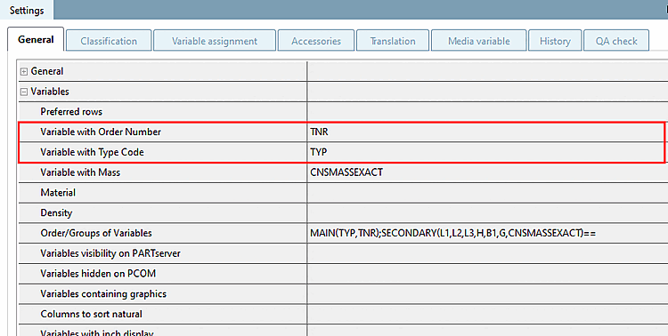 PARTproject -> Settings -> General tab -> Variables -> Variable with order number and/or variable with type code