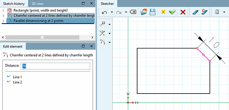 (The order makes no difference.) It is possible to place the chamfer outside the shape, see section Center chamfer on 2 lines via distance to intersection [Chamfer centered at 2 lines defined by distance to intersection].
