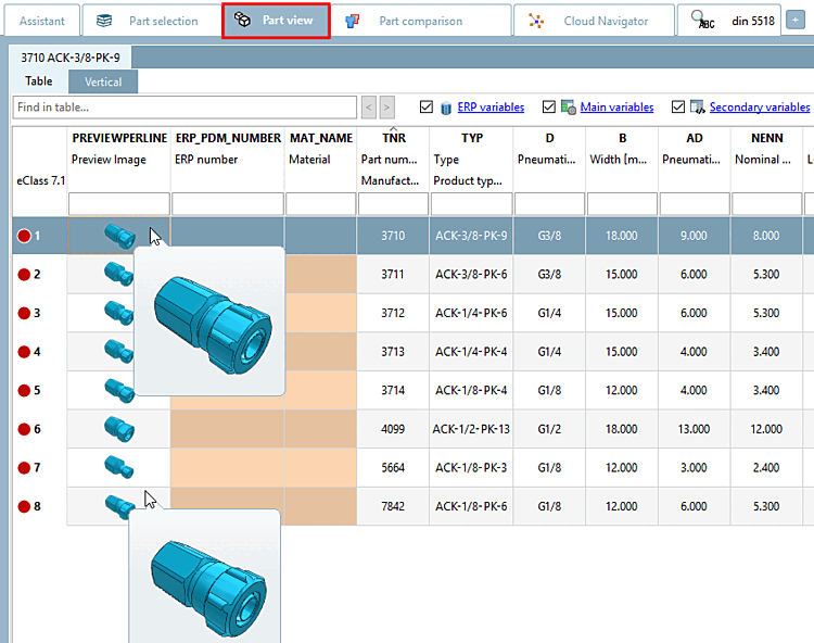If the Show preview images per line option has been activated in the settings dialog (and the preview images have also been generated per line for the corresponding catalog[48]), these are displayed in a separate Preview image [Preview Image] column in the table view. You can use Ctrl and the mouse wheel to enlarge the preview images or view them in the 3D tooltip.