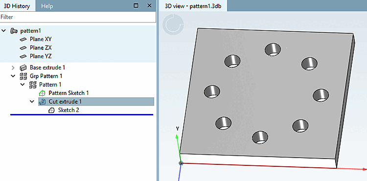 -> The rectangular pattern is displayed in the 3D history [3D History] under Grp Pattern.