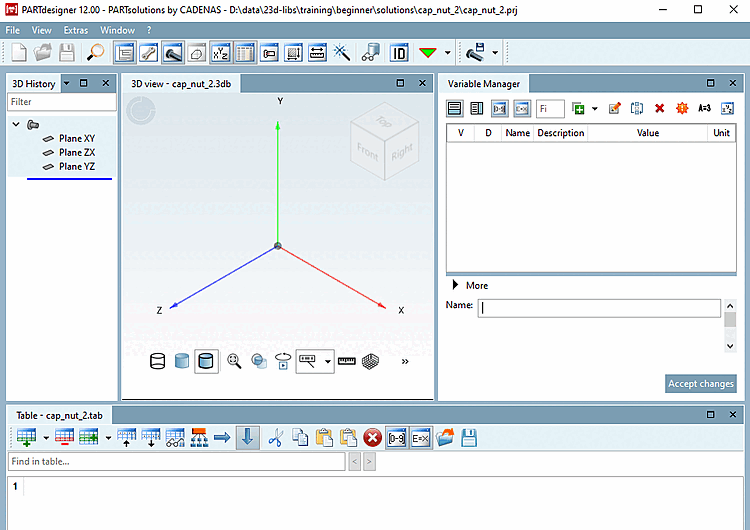 Because of the chosen Template, blank files for Geometry (cap_nut_2.3db) and Table (cap_nut_2.tab) are already available. Both files still have to be given some content.