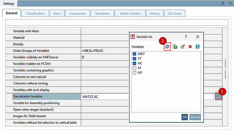 If you want to display table rows with graphics (*.png) in the project, first create a new variable/column at PARTdesigner. Then enter the file name of the desired graphic in the individual rows of the new column. Finally, open the Variable list dialog box in PARTproject (Browse of this field) and activate the variable in question.