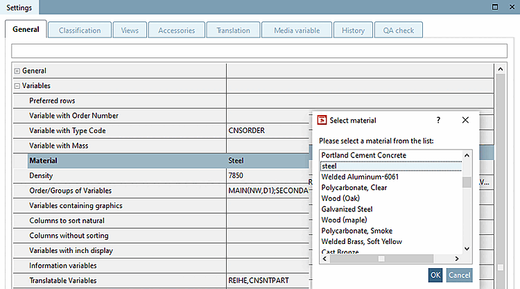 The following entries are automatically mapped to the corresponding class variables [Class variables] of the CNS classification and thus transferred to CAD during part export. See also Section 5.12.3.1.10, “Simple assigning of important variables to CNS classification ”.