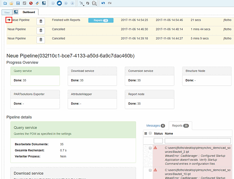 If you select a pipeline, the details are displayed. Please also note the Messages and Reports tabs for error analysis.