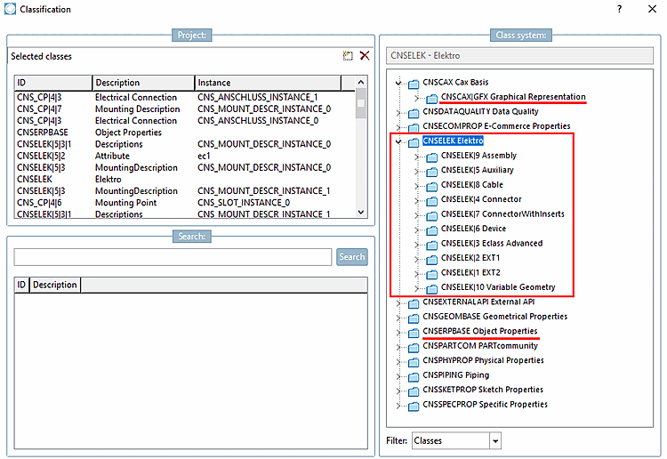 This chapter's focus is on using the CNS classification. That target systems additionally need to be classified according to eClass in order to identify the part type, remains untouched by this. Within the CNS classification, in addition to the labeling with specific electrical classes (CNSELEK [component level] or CNS_CP|4 [connection points]), the labeling with classes for determining the graphical representation (CNSCAX|GFX) or material characteristic properties (CNSERPBASE [see Section 5.12.3.1, “Classification (CNS) ”]) is also important, to name just a few.