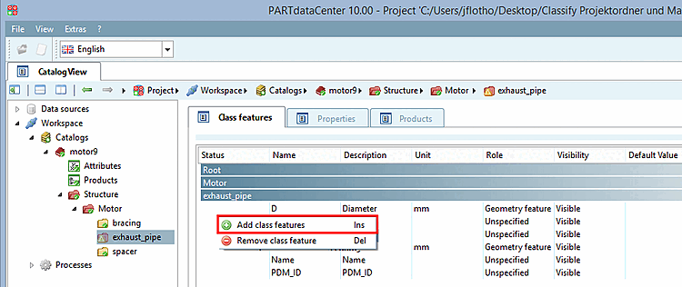 After selecting a class in the structure view [Structure], the tab pages Class characteristics [Class features], Products and Properties are displayed on the right.