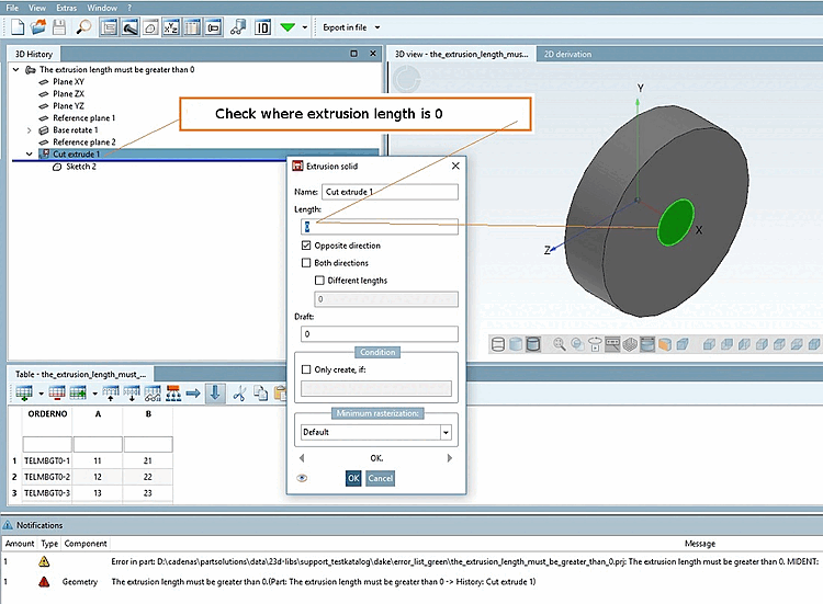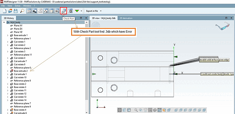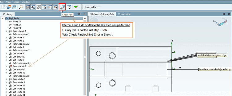 Solution: Open .3db in PARTdesigner. Find the error in Sketcher using the Check part [Check Part]