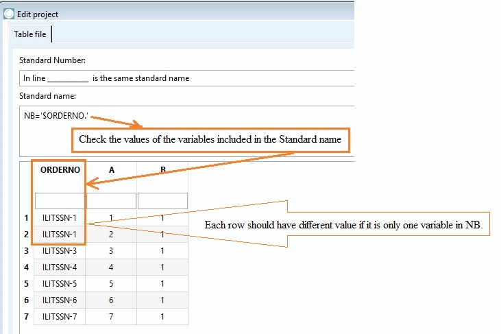 Solution: Change the same table values or enter more variables in the standard designation [Standard name] so that different values result. If the standard designation [Standard name] in the example above is extended from