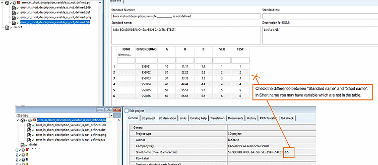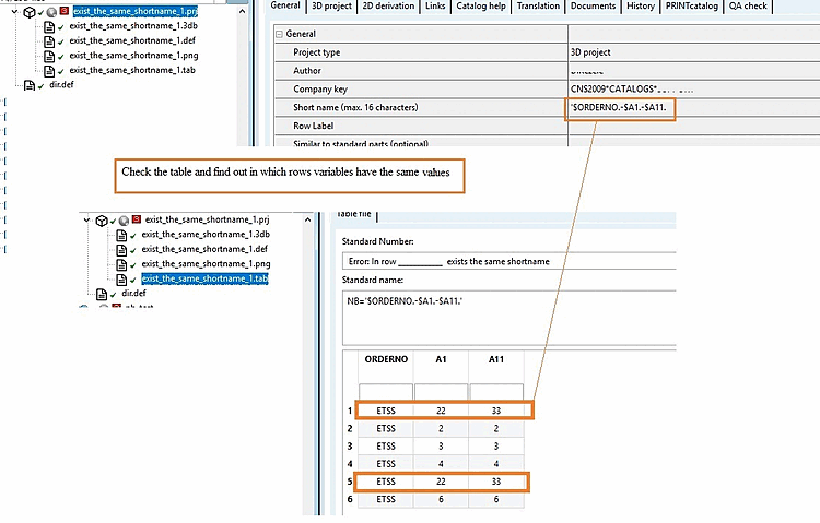 The error message appears if the formula of the standard designation [Standard name] is identical for several projects AND the table has the same values.