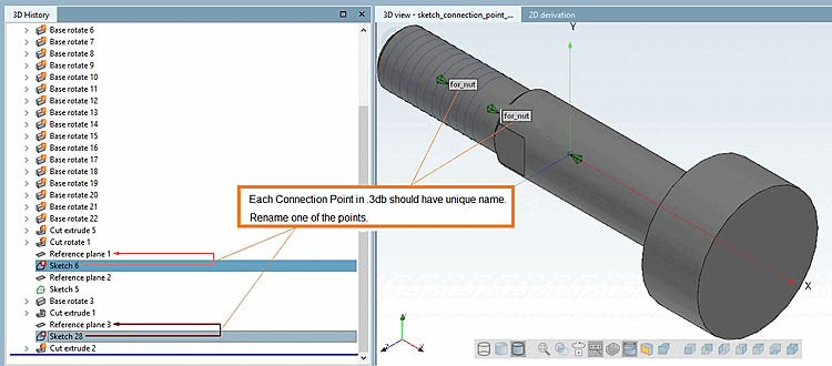Solution: Open 3db -> Sketch: Check the names of connection points and rename the affected ones so that each name is unique then.