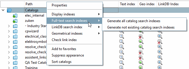 At the top level (catalogs ), the full-text search index can be generated completely new for all catalogs (Create all catalog search indexes [Create all catalog search indexes] ) or only added for non-existent catalog indexes (Create non-existent catalog search indexes [Create not existing catalog search indexes] ).