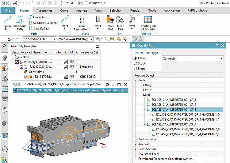If Electrical Routing is activated, the interface checks the CNS_CON_GR connection point attribute and groups ports that share the same attribute value.