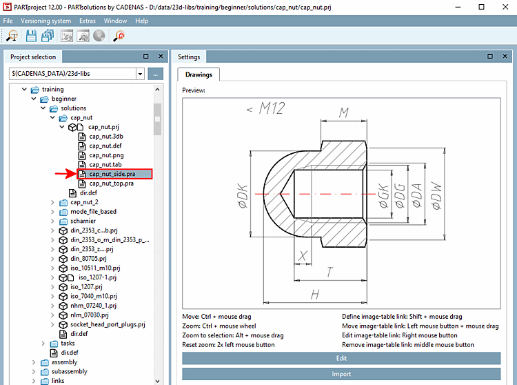 Dimensioning views are integrated into the project in the form of pra files in PARTproject and later displayed in the PARTdataManager technical Information [Technical details] docking window or in tooltips of preview images.
