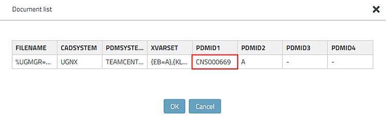 Clicking on the icon opens the Document list dialog box, which shows the PDMID, which in turn can be used to quickly find the relevant document in the PDM.