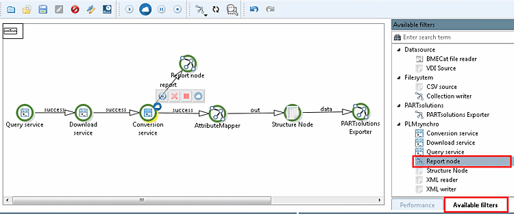 You will find the Report node filter under PLMsynchro. Drag the filter into the process.