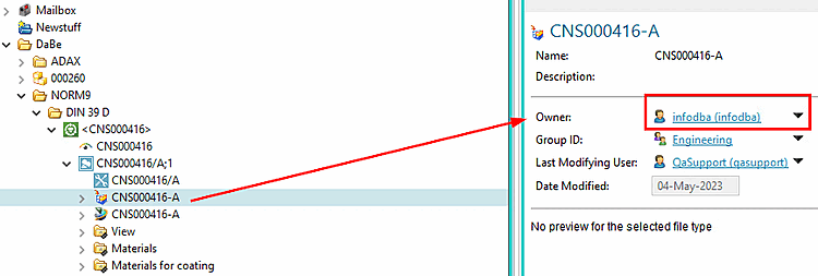 Example: Change the Owner of all CAD Datasets from "qasupport" to "infodba" and the Group from "dba" to "Engineering".