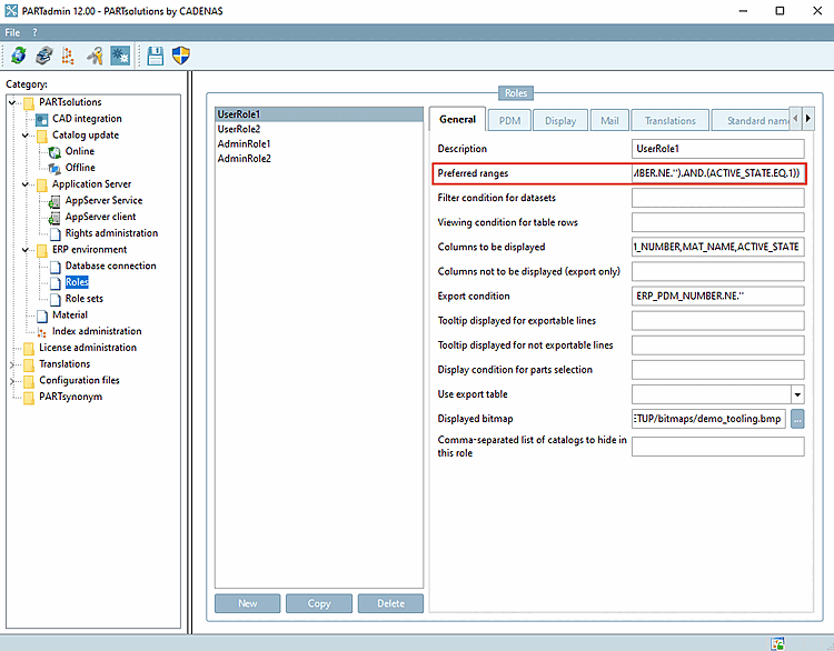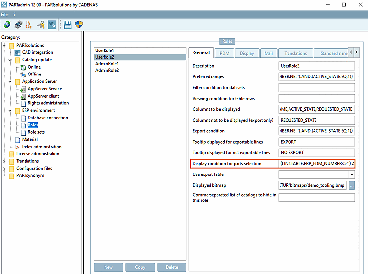 In the configuration file menuvisibility_PARTdataManager.cfg you define all the required roles and types of roles, i.e. what should be displayed for which role in PARTdataManager.