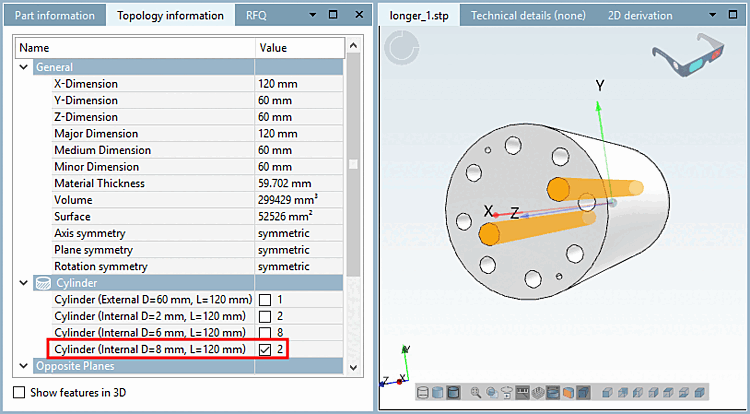 If you activate the Show features in 3D option, you can select a feature directly in the 3D view by clicking on it and display the topology information in the label (open by clicking on the plus sign). Click again to remove the selection. The check mark in the Topology information docking window is automatically set and removed again.
