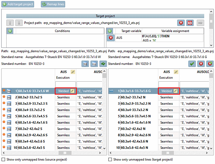 Initial situation: When changing a value range value, there is no adjustment in the right table.