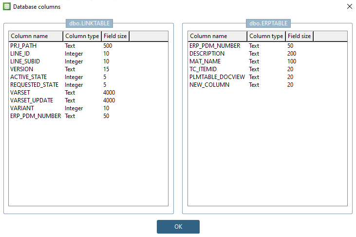 You can have the columns in the LINKTABLE and ERPTABLE displayed.