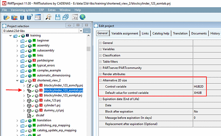 Create the alternative variable for the shortened 2D view, which is entered in PARTproject as a control variable [Control variable] (in the following example 'HUB2D')