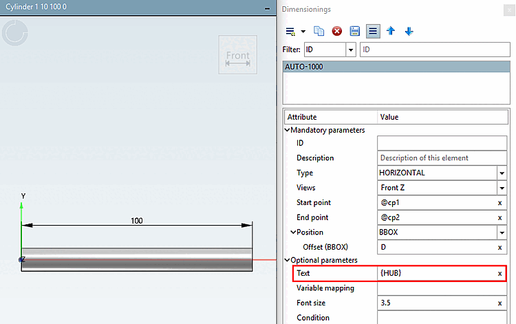 Optionally, you can set automatic dimensioning. The displayed dimension should not change when the shortened view is switched on! For this reason, no IF condition is used for text [Text], not even {AUTOMATIC}, but '{HUB}'.