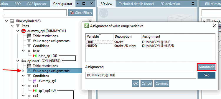 As the cylinder contains value ranges (HUB and HUB2D), please remember to make the value range assignments [Value range assignments].